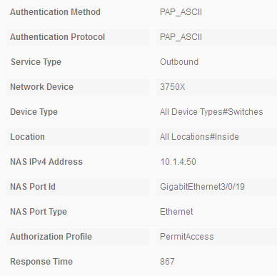 aaa new-model ! aaa group server radius ISE server name ISE20 deadtime 15 ! aaa authentication login default group ISE aaa authentication login CON none aaa authentication dot1x default group radius aaa authorization network default group radius aaa authorization auth-proxy default group ISE local aaa accounting update periodic 5 aaa accounting auth-proxy default start-stop group ISE aaa accounting dot1x default start-stop group radius ! aaa server radius dynamic-author client 192.168.90.205 server-key Radius123 ! aaa session-id common ! ip device tracking ! ip admission name Web-Guest proxy http inactivity-time 5 ! dot1x system-auth-control ! fallback profile Web-Guest-Fallback ip access-group Web-Auth-ACL in ip admission Web-Guest ! interface GigabitEthernet3/0/19 switchport access vlan 99 switchport mode access switchport block unicast authentication event fail action next-method authentication host-mode multi-auth authentication open authentication order webauth authentication priority webauth authentication port-control auto authentication fallback Web-Guest-Fallback mab dot1x pae authenticator dot1x timeout tx-period 5 spanning-tree portfast ! interface Vlan99 ip address 10.1.99.50 255.255.255.0 ip helper-address 10.1.4.100 ! ip access-list extended Web-Auth-ACL permit udp any any eq bootps permit udp any any eq domain ! ip radius source-interface Vlan4 radius-server attribute 6 on-for-login-auth radius-server attribute 6 support-multiple radius-server attribute 8 include-in-access-req radius-server attribute 25 access-request include radius-server dead-criteria tries 3 radius-server deadtime 30 radius-server vsa send accounting radius-server vsa send authentication ! radius server ISE20 address ipv4 192.168.90.205 auth-port 1812 acct-port 1813 key Radius123 ! line con 0 login authentication CON line vty 0 4 login authentication CON width 255 line vty 5 15 ! mac address-table notification change interval 0 mac address-table notification changeThe results are:
